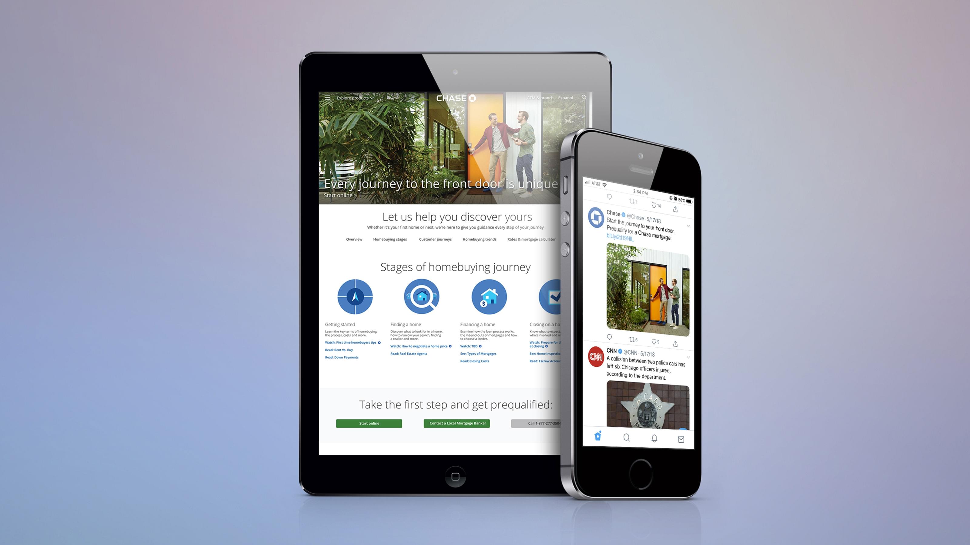 We developed a campaign thematic of “Journey to the Front Door”. The campaign celebrated the personality and uniqueness of the process for each person and used real customers to help share that message. We surrounded the campaign with video and social content, bank branch merchandising, and developed a custom campaign site where content and resources were made available that gave Chase new ways to think about and talk about their mortgage processes, tools and support.